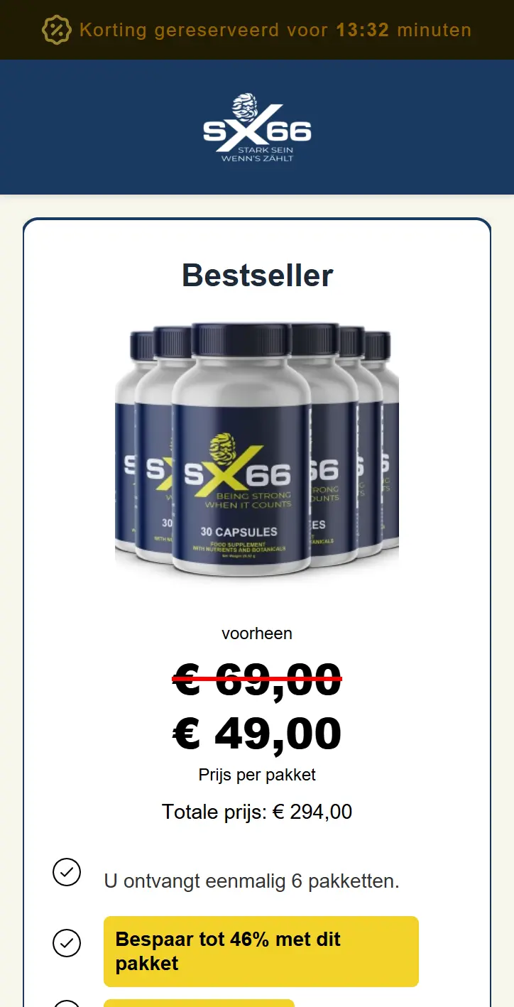 SX66® wordt op de officiële website gepresenteerd als een supplement voor mannen met focus op welzijn en vitaliteit. Voor volledige ingrediënten, gebruiksadvies, waarschuwingen, prijzen en garantie is de officiële site de beste bron.